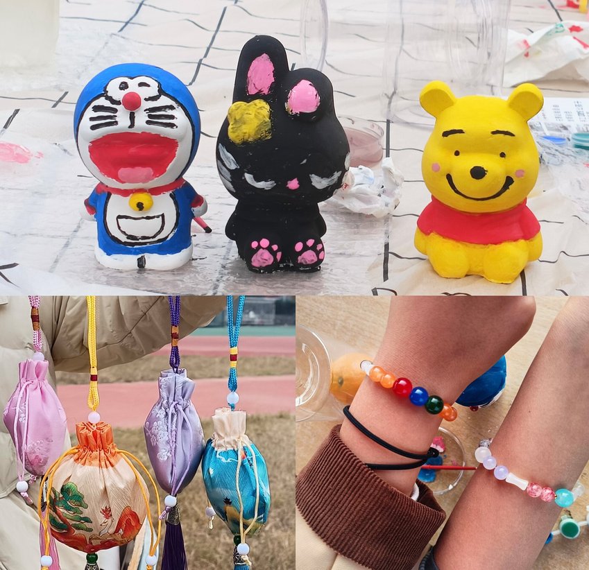 活动伊始,签名墙上很快布满了同学们的姓名与创意手印,秩序井然。游园会设置集章竞技与手工体验两大板块,十余项趣味活动同步开展,让同学们一站式解锁快乐。竞技场上,“同舟共济”考验团队协作的默契,“默契猜词”迸发思维碰撞的火花,“一圈到底”展现肢体配合的灵动,“沙包投准”比拼精准投掷的技巧,加油声、欢呼声此起彼伏;手工区内,石膏娃娃彩绘让纯白玩偶绽放个性色彩,手串制作将创意串成专属信物,同学们戴着一次性手套,专注调配颜料、挑选串珠,在动手创作中释放压力、陶冶情操。