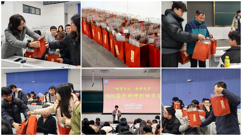 冬日暖阳送温情,考研冲刺护征程。在 2026 年考研进入关键冲刺阶段之际,为切实缓解学子备考压力、坚定升学信心,12 月 4 日晚 18:30,机电系于讲堂楼南 101 举办 “力学笃行,金榜题名” 考研慰问活动。系主任丁艳、副主任仝军令、学工办主任王广平及毕业班辅导员刘澜、兰昊出席活动,为即将赴考的学子们送上专属礼包与暖心关怀。