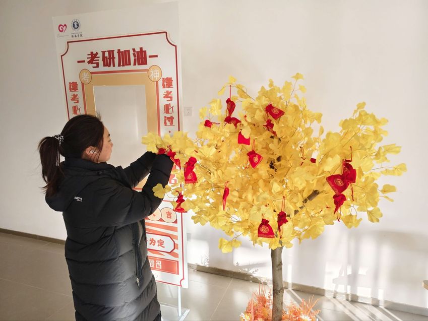 活动现场暖意融融,工作人员提前布置好书写区与祈福区,准备了精美贺卡、彩色马克笔和祈福挂绳。考研学子们纷纷驻足,或独自伏案,或三两结伴,在贺卡上写下心底的愿望、对自己的鞭策,或是对同窗的鼓励。完成贺卡书写后,学子们将写满祝福的贺卡系上祈福挂绳,亲手挂在金黄的银杏树枝头。微风吹拂,银杏叶簌簌作响,一张张贺卡随风轻摆,与满树金黄相映成趣,成为校园里一道温暖的风景线。每一张悬挂的贺卡,都是一个小小的心愿,更是一份无声的陪伴,让学子们感受到来自学校的关怀,也在彼此的祝福中汲取前行的动力。